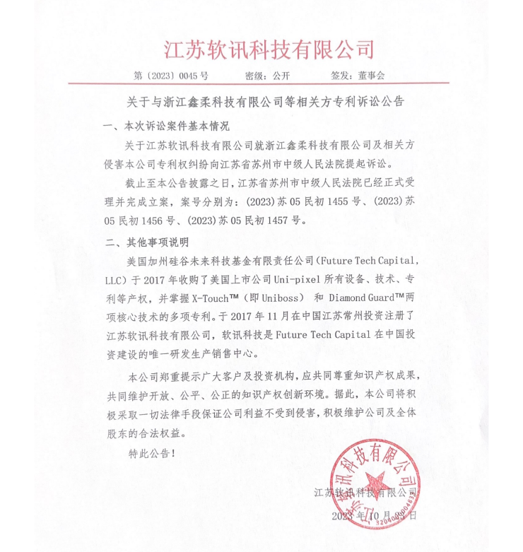 美國(guó)加州硅谷未來(lái)科技基金有限責(zé)任公司(Future Tech Capital, LLC現(xiàn)更名:Future Tech Capital, INC)于2017年收購(gòu)了美國(guó)上市公司Uni-pixel所有設(shè)備、技術(shù)、專(zhuān)利等產(chǎn)權(quán),并掌握X-Touch?(即Uniboss) 和 Diamond Guard?兩項(xiàng)核心技術(shù)的多項(xiàng)專(zhuān)利。Future Tech Capital于2017年11月在中國(guó)江蘇常州投資注冊(cè)了江蘇軟訊科技有限公司,注冊(cè)資本:6315.7895萬(wàn)美金;主要經(jīng)營(yíng):新型電子元器件、觸控系統(tǒng)、觸控面板、電子電路、無(wú)線(xiàn)通信設(shè)備的天線(xiàn)、導(dǎo)電膜、屏蔽膜等研發(fā)、生產(chǎn)和銷(xiāo)售;軟訊科技是Future Tech Capital在中國(guó)投資建設(shè)的唯一研發(fā)生產(chǎn)銷(xiāo)售中心。