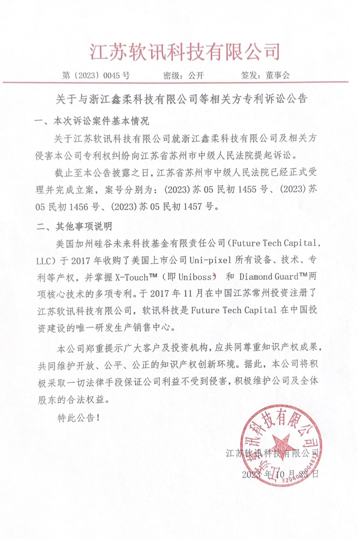 2023.10.26關(guān)于江蘇軟訊科技有限公司就浙江鑫柔科技有限公司及相關(guān)方侵害本公司專利權(quán)糾紛向江蘇省蘇州市中級(jí)人民法院提起訴訟。