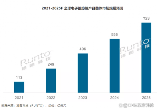 根據(jù)洛圖科技(RUNTO)發(fā)布的《全球電子紙市場(chǎng)分析季度報(bào)告(Global ePaper Market Analysis Quarterly Report)》,2021年,全球電子紙模組出貨量為2.1億片,相比2020年增長(zhǎng)29.1%,2022年將翻倍至4.07億片;2021年終端產(chǎn)品市場(chǎng)規(guī)模為113億美元,相比2020年增長(zhǎng)超過(guò)32.9%,到2025年預(yù)計(jì)能達(dá)到723億美元,五年復(fù)合增長(zhǎng)率高達(dá)59%,電子紙有望駛?cè)朐鲩L(zhǎng)“快車道”。