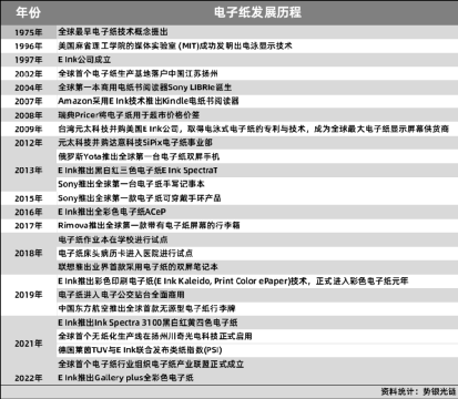 臺(tái)灣元太科技(E Ink)工業(yè)股份有限公司是臺(tái)灣永豐馀造紙集團(tuán)于1992年投資成立,早期主要經(jīng)營(yíng)TFT-LCD(薄膜晶體管液晶顯示器)面板業(yè)務(wù),2009年并購(gòu)了美國(guó)E Ink公司,完成了電子紙上中游產(chǎn)業(yè)鏈的布局整合,從2016年底開(kāi)始淡出LCD業(yè)務(wù),專注于電子紙的研發(fā)與制造。元太科技在全球電子紙產(chǎn)業(yè)占有重要地位,是全球最大的電子墨水膜供應(yīng)商。目前市場(chǎng)上約百分之九十的電子紙閱讀器,皆采用E-Ink電子紙,是唯一具有上游電子墨水技術(shù)與中游電子紙制造技術(shù),并具量產(chǎn)能力與規(guī)模的制造企業(yè)。