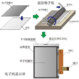 電子紙顯示模組的基本結(jié)構(gòu)包括電子紙膜片(模組的核心材料)、底板(控制電子紙每個(gè)像素的黑白變化)、驅(qū)動(dòng)芯片(控制底板每個(gè)像素的工作時(shí)序和狀態(tài))、透明保護(hù)膜和封邊膠等。