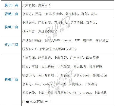 電子紙產(chǎn)業(yè)鏈包括膜片廠商、背板廠商、模組廠商、芯片廠商和整機(jī)廠商,其中核心的原材料為電子墨水膜,全球主要量產(chǎn)電子墨水膜的企業(yè)僅有兩家,分別為元太科技(8069.TW)和廣州奧翼電子科技股份有限公司。