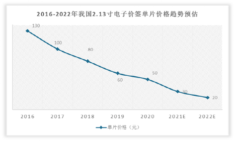 據(jù)相關(guān)調(diào)研數(shù)據(jù)顯示,我國(guó)電子價(jià)簽的單片價(jià)格比紙質(zhì)價(jià)簽稍高。并隨著電子價(jià)簽市場(chǎng)滲透率的攀升,我國(guó)電子價(jià)簽單片價(jià)格終會(huì)降低。以2.13寸電子價(jià)簽為例,2016年其單片價(jià)格約130元,預(yù)計(jì)2022年單價(jià)將會(huì)降至20元。