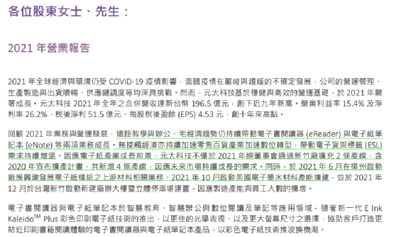 因應(yīng)電子紙產(chǎn)業(yè)成長(zhǎng)前景,元太科技不僅于2021年經(jīng)董事會(huì)通過(guò)新竹廠擴(kuò)充2條產(chǎn)線,含2020年宣布擴(kuò)產(chǎn)計(jì)劃,共新增4條產(chǎn)線,因應(yīng)未來(lái)市場(chǎng)持續(xù)成長(zhǎng)的需求。