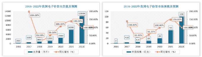 2016年我國(guó)電子價(jià)簽出貨量約200萬(wàn)片,預(yù)計(jì)到2022年出貨量有望提升至12000萬(wàn)片,2022年我國(guó)電子價(jià)簽市場(chǎng)規(guī)模或?qū)⑦_(dá)100億元。